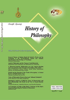 Rajab‘alī Tabrīzī became involved in religious wayfaring and purification of the soul after his preliminary studies and, finally, joined the classes of Ḥakīm Mīr Fendereski. Most biographers acknowledge Tabrīzī’s inward purification and mastery over physics, logic, and philosophy, and only a few of them, such as the writer of Riyāḍ al-‘ulamā and some of his students, have accused him of not having mastery over Arabic literature. Ḥakīm Tabrīzī, who lived about 30 years after Mullā Ṣadrā, was one of the serious critics of Sadrian thought. In doing so, he expanded the Peripatetic literature, reinterpreted some of its principles, and introduced a number of new terminology so that a cradle could be provided for the analysis of new problems within the framework of Neo-Peripateticism. However, he did not try to record all his teachings in writing and spent most of his time on individual wayfaring, teaching intellectual sciences, and training his students. Therefore, some of his knowledgeable students, particularly Pirzādeh, Qawām al-Dīn Rāzī, and Muḥammad Sa‘īd Ḥakīm, transcribed his teachings and scientific notes. The treatise of Ithbāt al-wājib, al-Uṣūl al-aṣfīyah, al-M‘arīf al-ilāhīyyah, Muṣannafāt-i Qawām al-Din Rāzī, and Sharḥ-i Tawḥīd Ṣadūq by Qāzī S‘aīd comprise the most important research sources on Ḥakim Tabrīzī’s neo-Peripatetic school of philosophy. The reports of translators and the ideas and theories of some contemporary editors and researchers have also been evaluated in this paper.