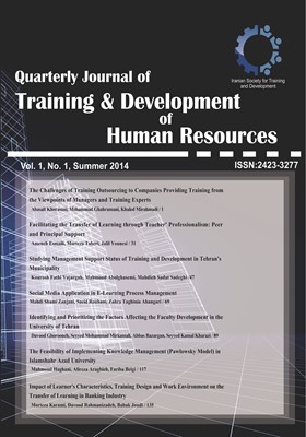 The present study intends to investigate the role of individual and environmental characteristics of teachers in transfer of learning in the sixth grade. A correlation method was performed to identify the relationships between variables that affect transfer of learning. The population was the sixth grade teachers in the district one and two of Ardabil City, who participated in summer training programs in school 1392-1393. Regarding the questionnaire items, 205 questionnaires were distributed randomly among the participants. Instruments including Teacher Professionalism Questionnaires, teacher self- efficacy, principal support, peer support and transfer of learning were used for data collection. Confirmatory factor analysis used to prove construct validity of the instruments. Path analysis results showed as follows: Peer support has- directly and indirectly- a positive effect on the transfer of learning as one of the school environmental factors through teacher professionalism (as a mediating variable), but the effect of this variable on teachers' self-efficacy was not significant. Also, principal support has an indirect positive effect on the transfer of learning, but the direct effect of principal support and self-efficacy on the transfer of learning was not significant. The results also shows that the transfer of learning to the workplace largely depends on teachers’ professionalism and peer support from the transferring process and the use of leanings in the classroom. The results can improve the schools’ environment and the management of personal and environmental factors, and finally can facilitate the transfer of learning.