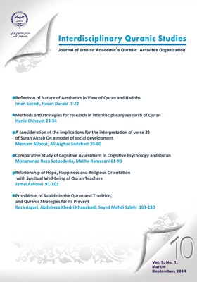 Individual excellence and social development, natural need that every man seeks, and dignity of the Holy Quran and the authentic needs of real people. In this study, the researchers in the light of the interpretation and semantics of verse 35 of Surah Ahzab with interpretation method, a system of individual excellence and social developments have raised. In this method, after selecting a verse and reflect on it, meditate in the context of the verse, and finally, reflection takes place at all Syaqh next or previous chapter. And written statements extraction and matching them with the community to discuss the validity and interpretation. Base of the subject, the beginning of this evolutionary movement of Islam; it is meant to serve God and bring down the surrender of his. In this direction, noted that the mention of God, the last of this move of God's forgiveness and a great reward for human development, which will include and without resorting to the Prophet and Prophet's Inmate, moving in the direction of excellence and perfection is not possible and the highest manifestation of God mentioned, appreciate the grandeur and dignity of the Holy Prophet and send blessings upon him and Prophet's Inmate is precious.