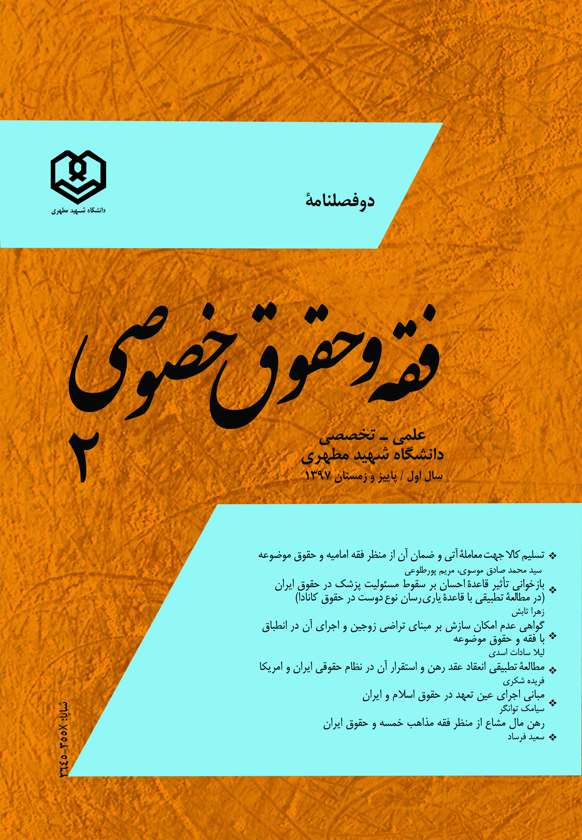 Abstract: Mortgage of jointly owned property (indivisum) is permissible according to Imamiyah, Maliki, Shafi’i, and Hanbali (except Hanafi) schools of Law because it is an instance of the rule of dominion. This is because conclusion of the mortgage contract does not mean possession of the jointly owned property. It is clear that submission of the jointly owned property to the mortgagee, in cases where it requires possession of the shares of the other partners, requires obtaining their consent. In cases where the mortgager submits the property to the mortgagee without the consent of the other partners, he shall be considered legally responsible for that. However, in cases where the submission of property means evacuation, the submission of the property does not mean possession of the shares of other partners, thus according to the jurisprudence of the above-said schools of law it does not need their consent for evacuation. This paper intends to study these issues in the jurisprudence of the abovementioned five schools of law and in the Iranian law.